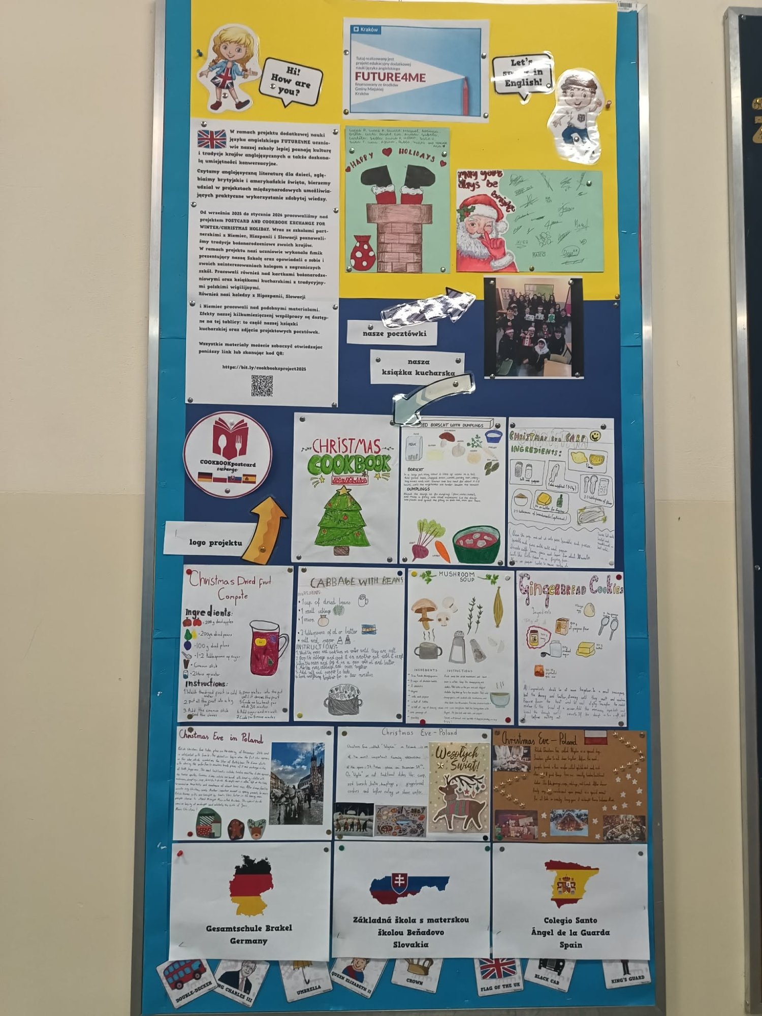 Od września 2025 r. do stycznia 2026 r. uczniowie i nauczyciele naszej Szkoły pracowali nad projektem Postcard and cookbook exchanege for winter/Christmas holidays. Wraz ze szkołami partnerskimi z Niemiec, Słowacji i Hiszpanii poznawaliśmy tradycje bożonarodzeniowe swoich krajów.