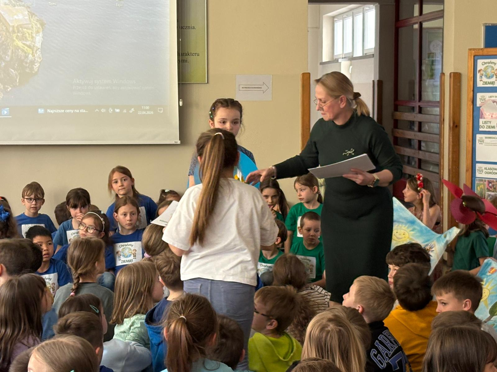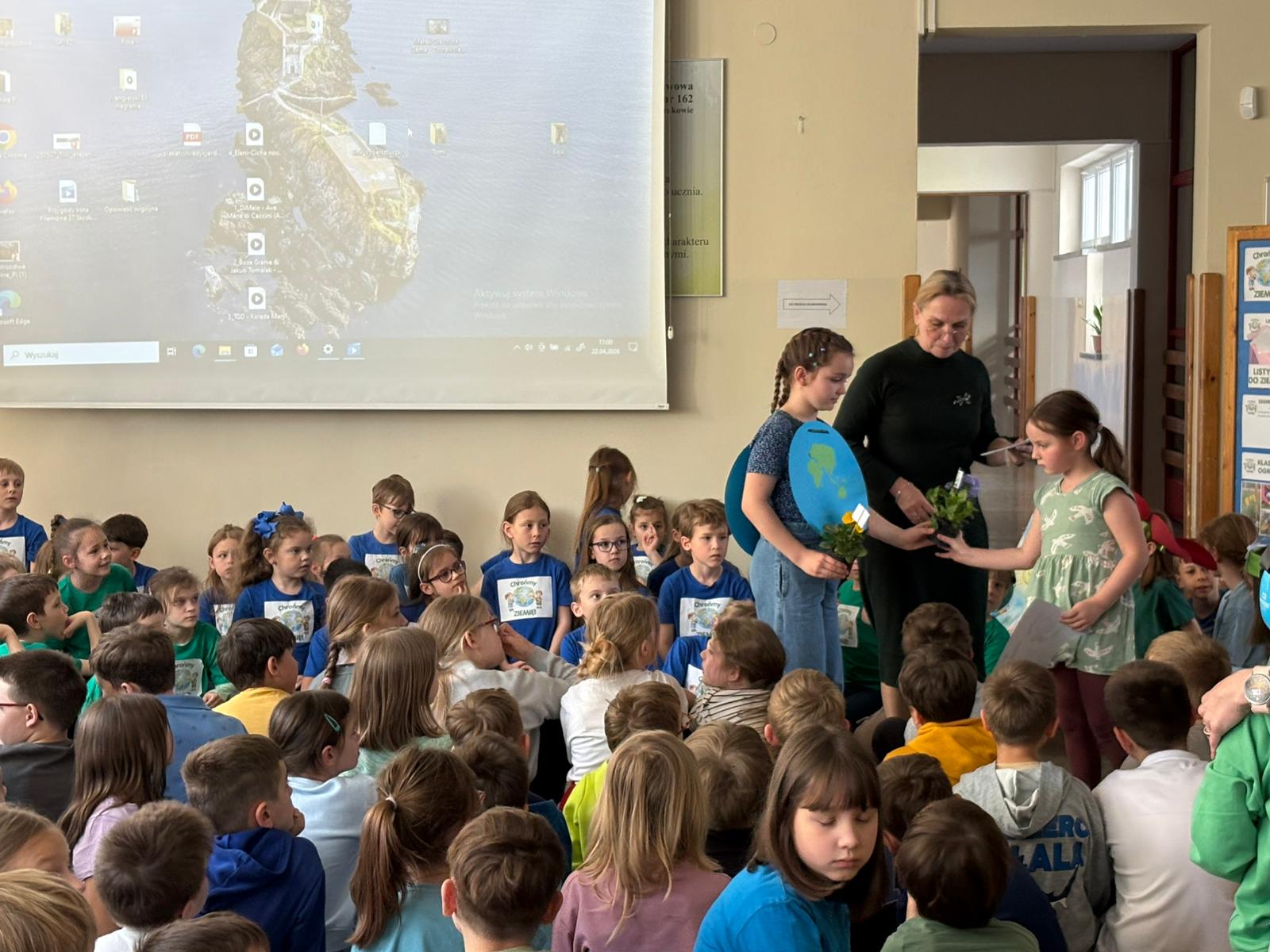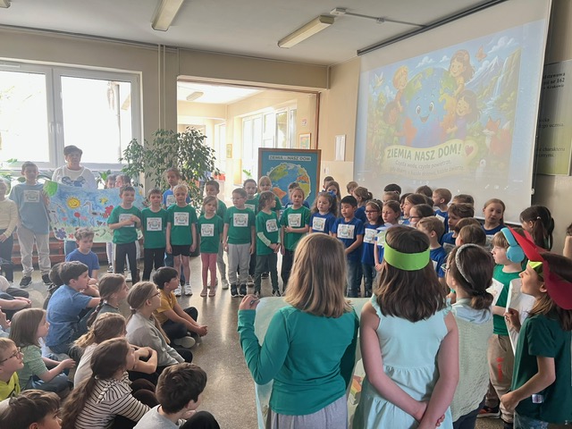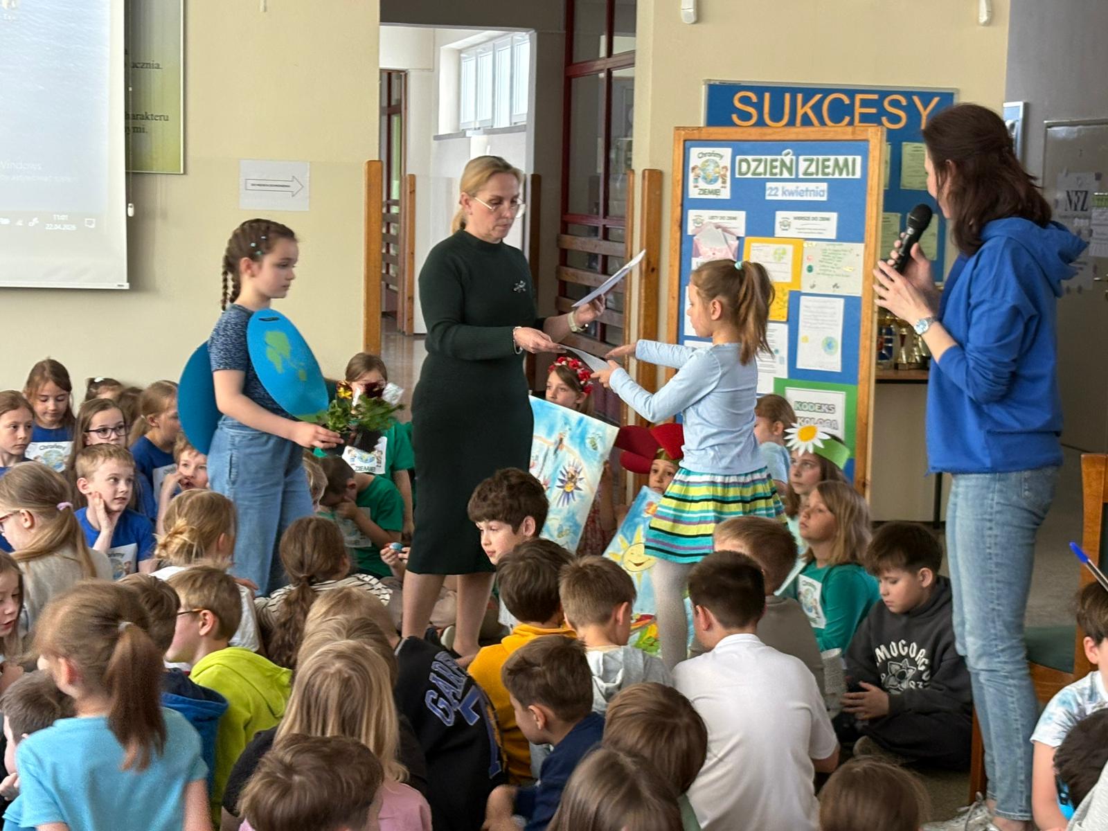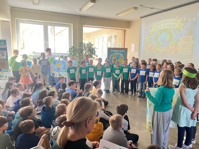 Dziś w naszej szkole odbył się uroczysty apel podsumowujący działania ekologiczne uczniów klas 0–3 z okazji Dnia Ziemi.