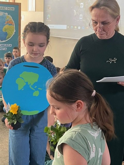 Szczególnym momentem apelu były podziękowania od Pani Ziemi, która doceniła troskę i zaangażowanie uczniów i każda klasa otrzymała dyplom uznania oraz sadzonkę bratka, którą uczniowie będą mogli posadzić i dalej troszczyć się o przyrodę.